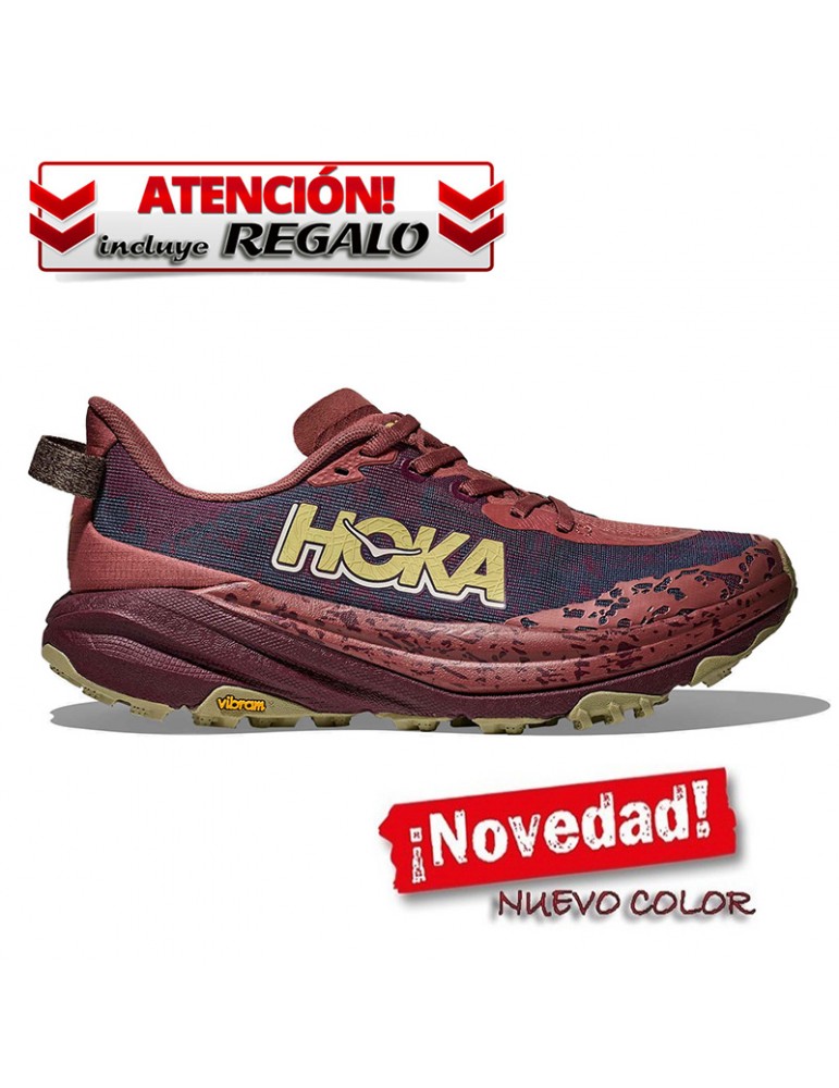 Las zapatillas Hoka One One Speedgoat 6 han sido concebidas para afrontar recorridos técnicos. Con un mayor ajuste, estabilidad y durabilidad consigue ser la versión mas ligera hasta el momento. Una media suela más ancha que crea una plataforma más estable con áreas reforzadas. Su suela Vibram incorpora tacos de caucho más agresivos para soportar todo tipo de terreno accidentados, mientras que la parte superior ofrece una gran comodidad. Las Speedgoat 6 son perfectas para lanzarte a los terrenos más técnicos y vencerlos sin problemas. El empeine proporciona soporte completo hasta el ante píe y la puntera de caucho complementa la protección para los dedos.